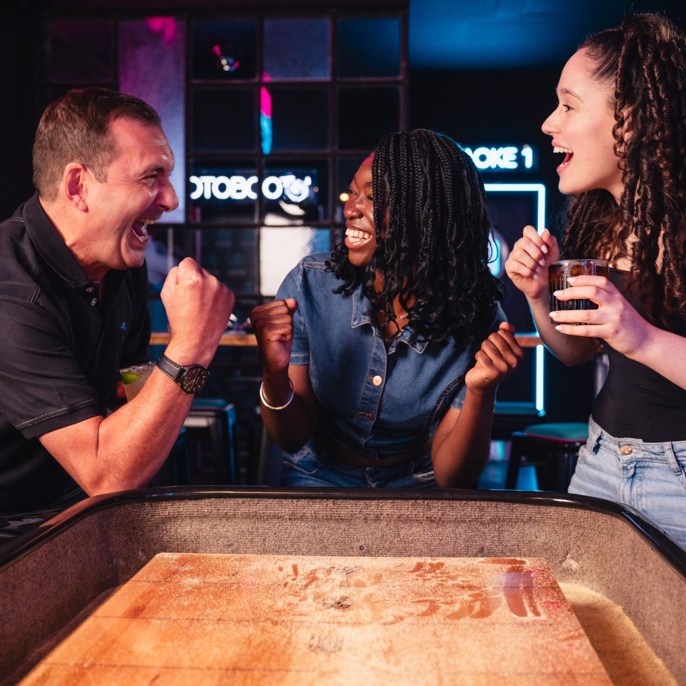 Shuffleboard at BOOM BATTLE BAR starts from £15 per table. The price is per lane, not per table. Each table holds up to 6 players.